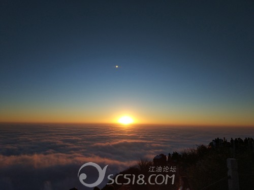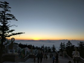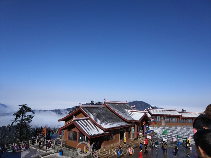 今天天氣不錯,人也挺多的,太陽把雪都化成水,夾雜著冰,一路很是不好走。一路上賣簡易冰抓的很多,但對于冰和水的路面作用甚小。我們提前帶了比較專業(yè)的冰抓,一路引來無數(shù)人的羨慕。我們也可以大步向前。提醒一下大家這個季度去的一定帶專業(yè)冰抓,不然摔跤是難免的。尤其有老人和小孩的一定要注意。在接引殿買了索道票來回120元/人,兒童70元/人。索道很快就到了金頂,這時差不多3點了。提前在網(wǎng)上訂的金頂大酒店358元豪華標(biāo)間送滑雪票。在酒店休息到差不多5點出去,繼續(xù)上金頂(金頂大酒店到金頂還有差不多1千米左右的距離,主要是樓梯)。這段路中間有幾個觀景平臺,站在這里可以看到瓦屋山等幾座名山。