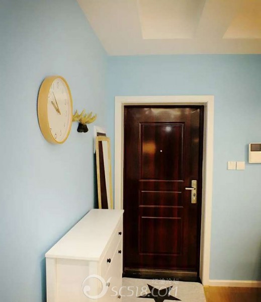 因?yàn)閼粜兔娣e的原因,玄關(guān)理所當(dāng)然的別省略了,也沒(méi)怎么做裝修,只放了個(gè)簡(jiǎn)潔的白色鞋柜和全身鏡,看著還寬敞些。