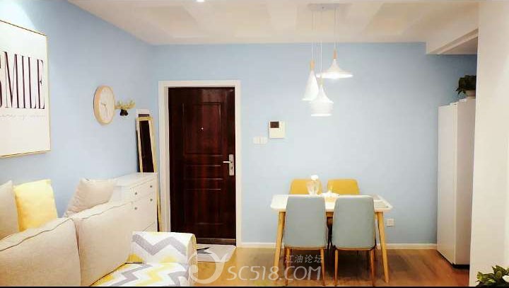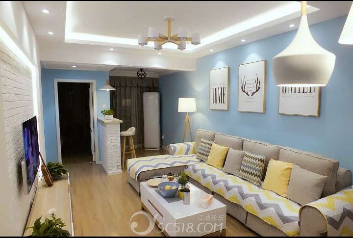 整個(gè)客廳除去電視背景墻,都刷了天藍(lán)色的墻,一進(jìn)門定感受到一絲清涼,加上吊頂和燈的配合,讓整個(gè)客廳又亮又干凈,還帶有溫馨。